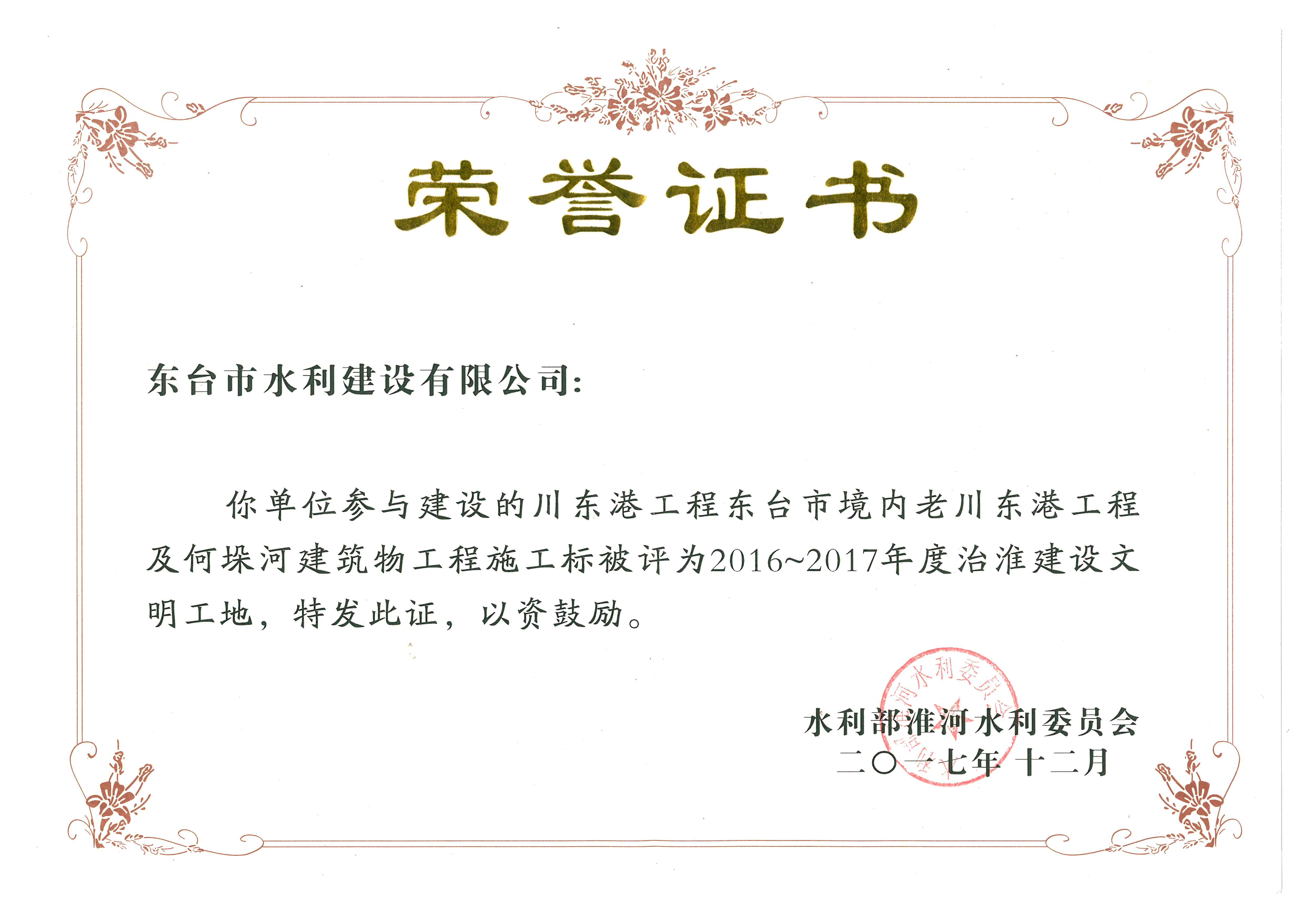 川東港建筑物文明工地榮譽證
